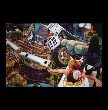 Works presented at "The Scene of the Accident" have roots from as early as 2004. It was at this point Sasayama started to produce his own dense watercolor paints (mixing glycerin, pigment, ethanol and other materials) to illustrate the consequences of fatal events. The scenes of catastrophes are presented as vivid patterned carpets with no clear distinction between figures, no definite silhouette lines, no structure and almost no composition. The visual aspect of the scenes of car crashes develop their own imaginary, similar to arabesque patterns and non-figural (or post-figural) abstractions. At the same time, thanks to the dense "fleshy" watercolors, the image of the mortal incidents paradoxically have a light, lively sensibility. The steel frames of the cars and the men inside are not just crushed, but experience such a strong collision that it is as if the metal has accidentally swallowed the corporeal: the pieces of the catastrophe and the place of the accident are soaked with human-like softness and warmth. In this way, while presenting the heavy scenery of dead bodies and ruined technology, "The Scene of the Accident" Exhibition bursts with vitality and the lusciousness of life, grasping both sides of the accident: its "life" and its "death".